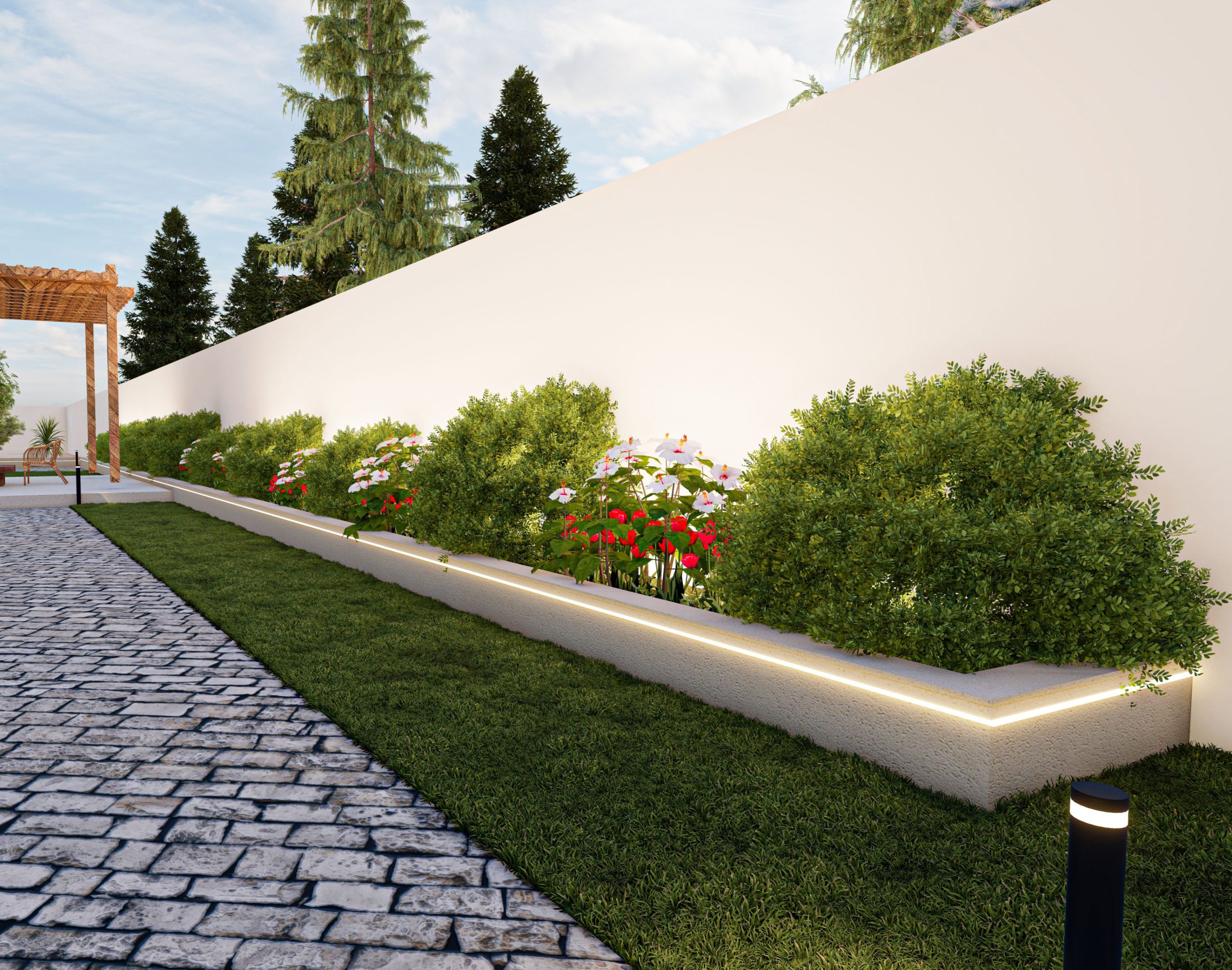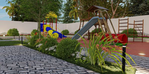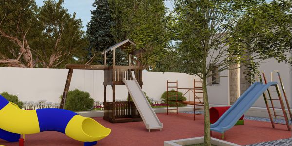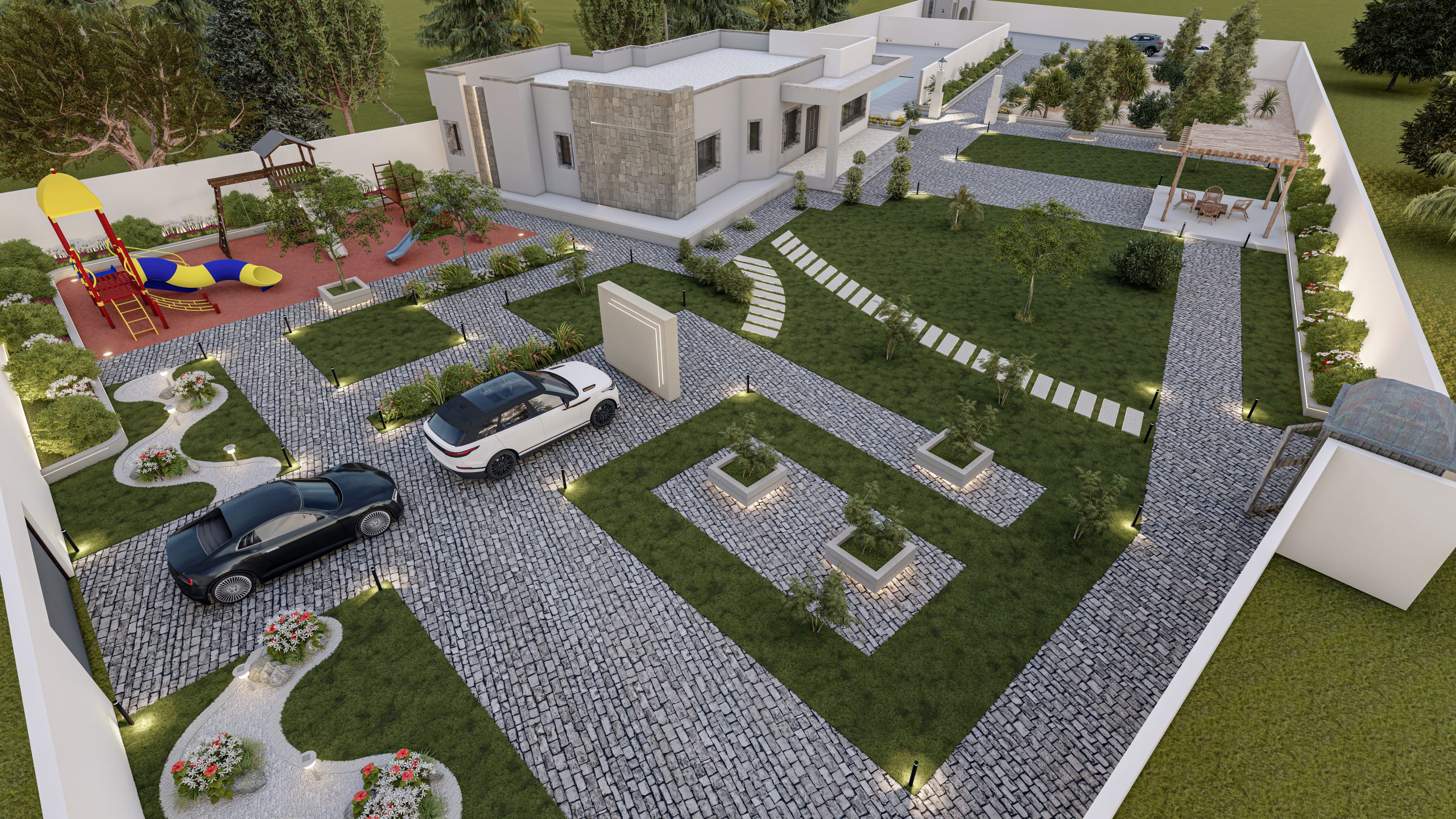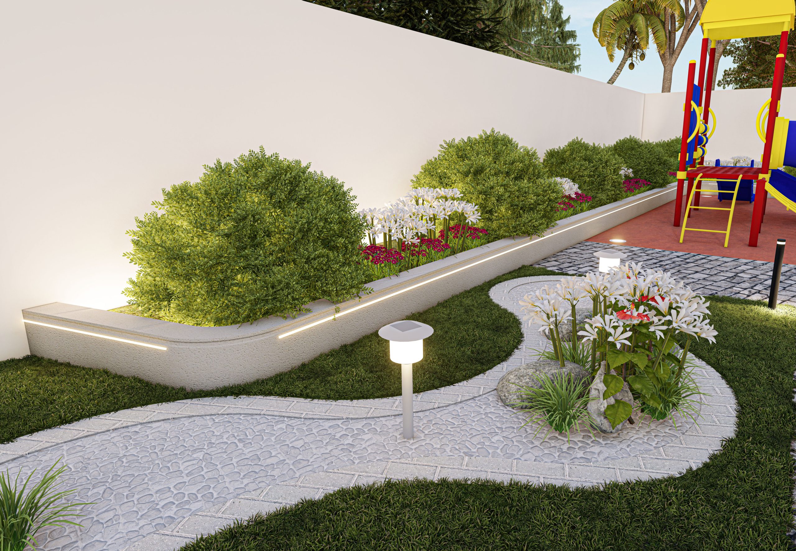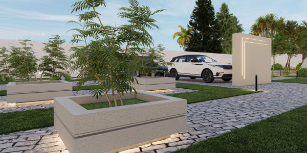 The design of the rest area garden integrates the lawn and flooring without any additional elements, according to the client’s preference. The existing plants on site were incorporated, and the design was adapted around them.
