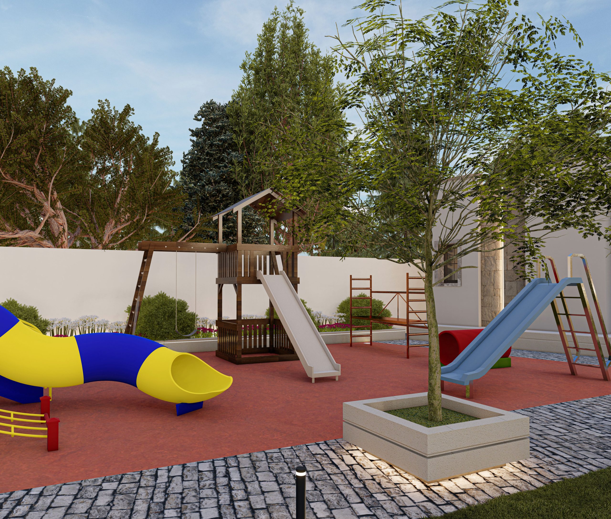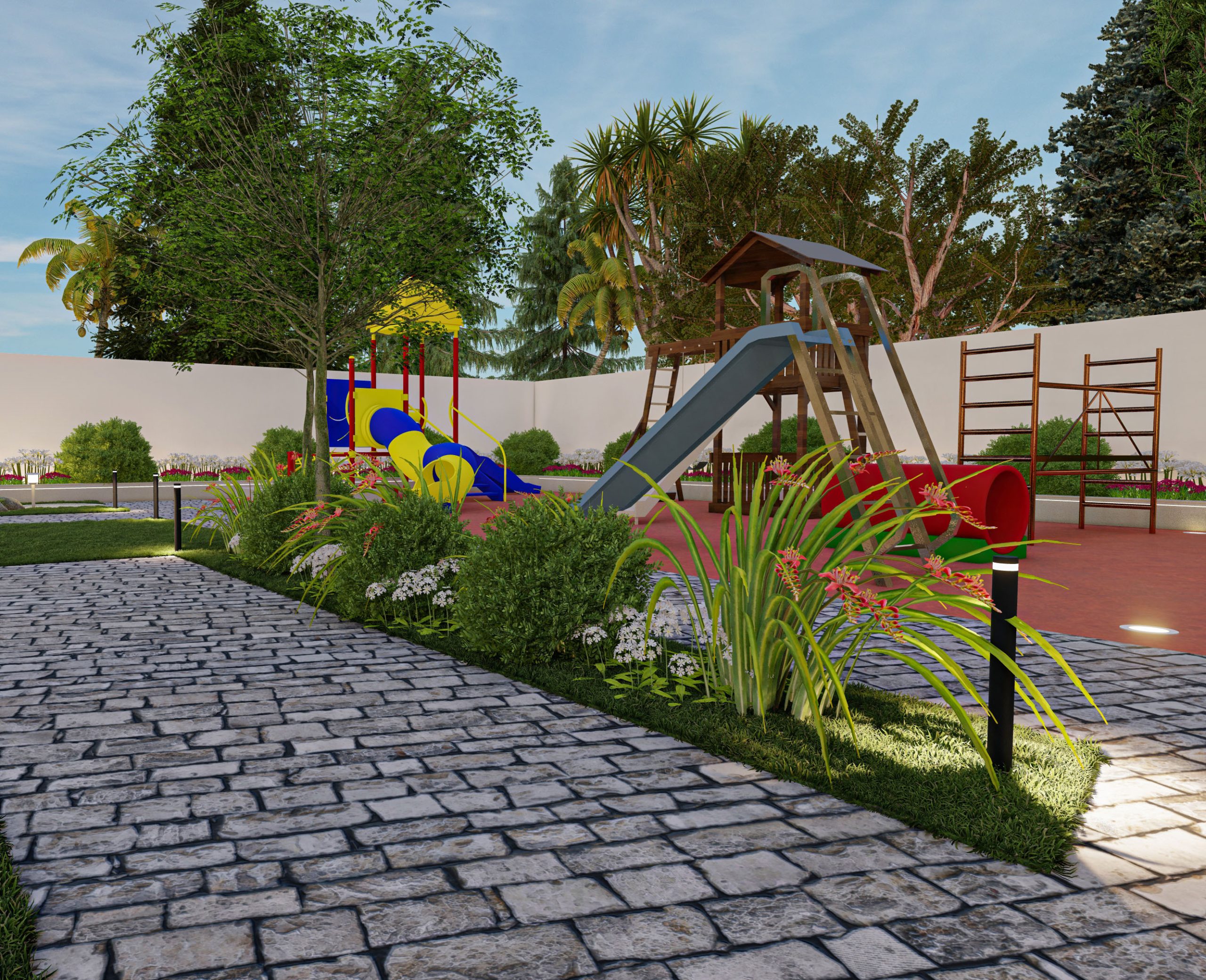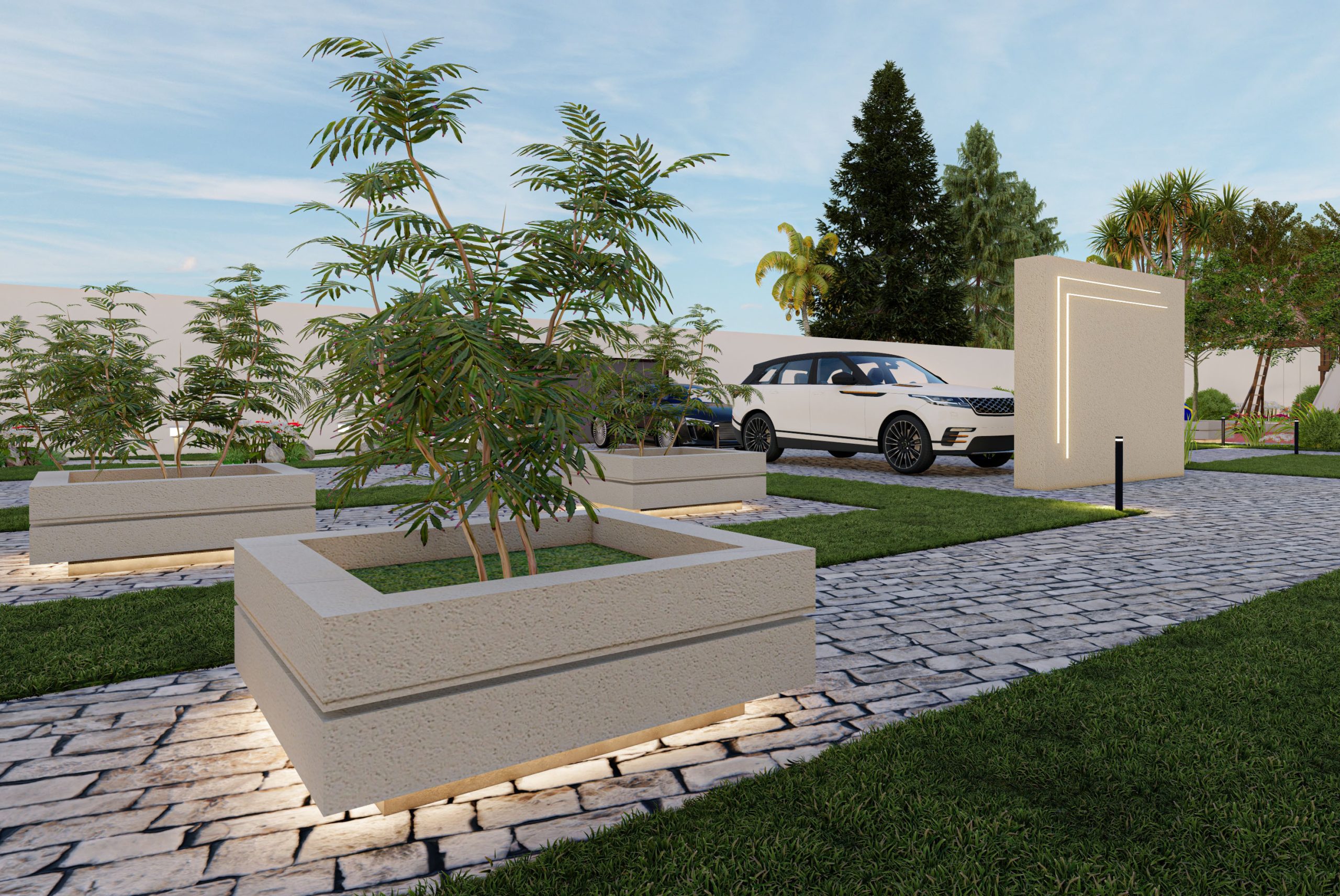 The design of the rest area garden integrates the lawn and flooring without any additional elements, according to the client’s preference. The existing plants on site were incorporated, and the design was adapted around them.